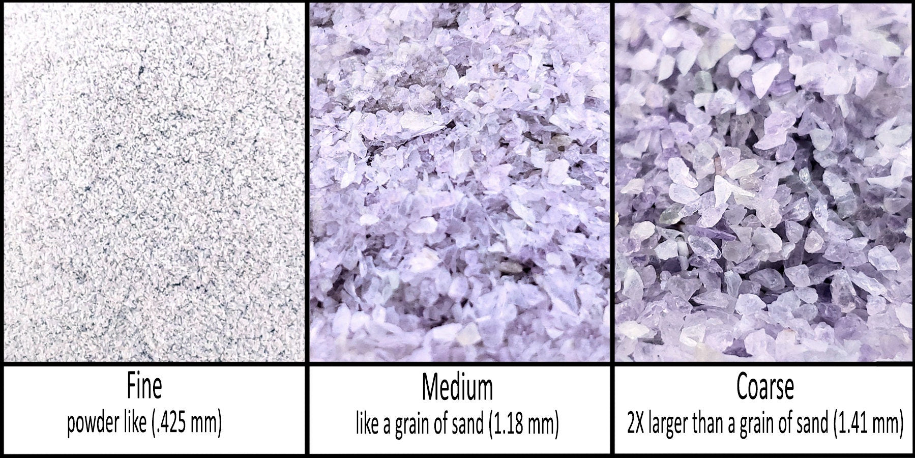 - Crushed and separated into Fine(0.425mm), Medium(1.18mm) and Coarse(1.41)