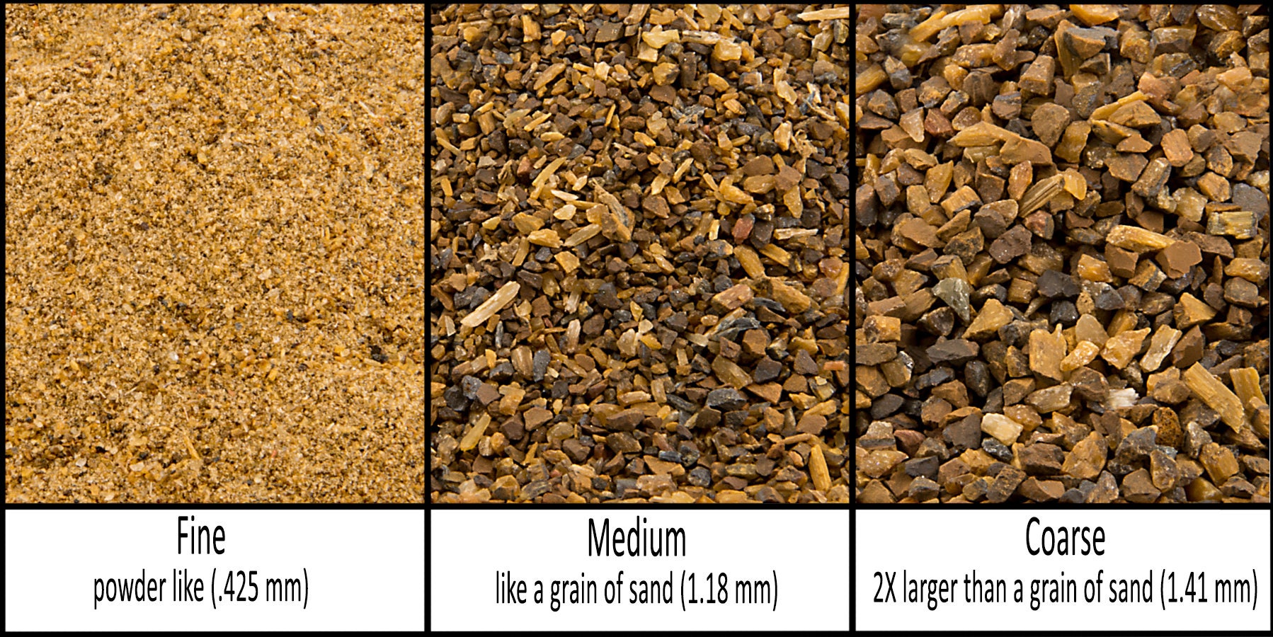 - Crushed and separated into Fine(0.425mm), Medium(1.18mm) and Coarse(1.41)