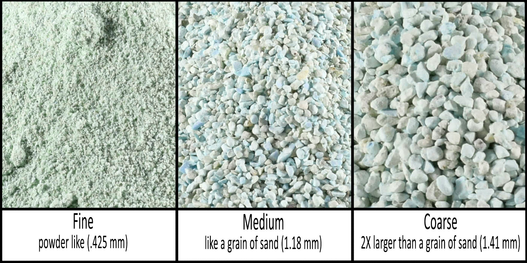- Crushed and separated into Fine(0.425mm), Medium(1.18mm) and Coarse(1.41)
