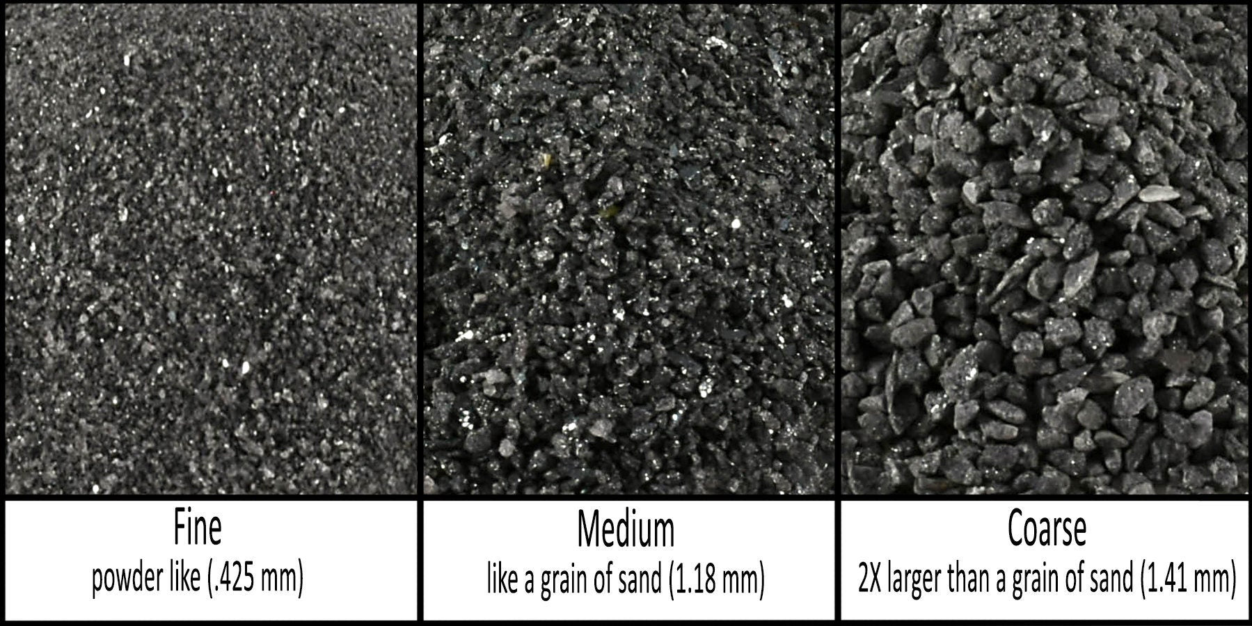 - Crushed and separated into Fine(0.425mm), Medium(1.18mm) and Coarse(1.41)